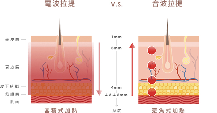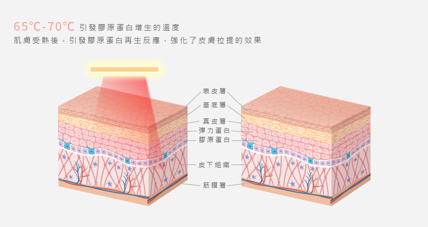 運用聚焦式超音波的方式,將65°C~70°C的熱能聚集成無數的凝結點,再以「由內而外」的方式加熱,讓鬆弛的SMAS筋膜層受熱後收縮,就像為肌膚的緊緻打好基底一樣,基底穩固了上層的肌膚就自然拉提緊塑,加上刺激膠原蛋白增生,臉部線條更能顯出年輕感。