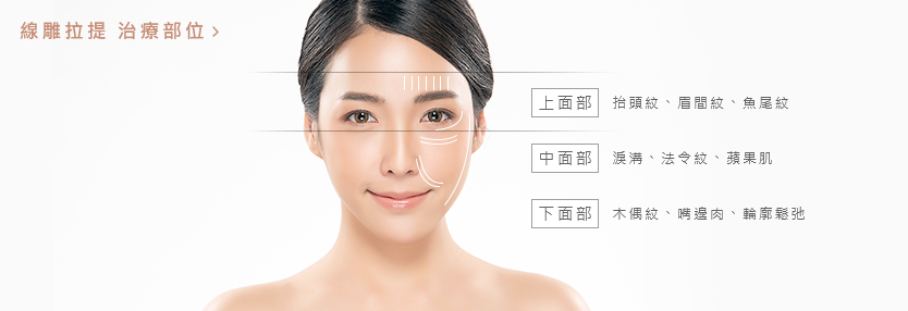 線雕拉提(拉皮)原理,是將特殊規格的手術用縫線,利用微創技術將鋒線埋入皮膚內(創口小、隱藏於髮際線內),利用線材抓取固定皮膚的能力,除了向上拉的力量外還同時刺激膠原蛋白增生,立即達到拉提鬆弛組織的效果並增添澎潤感。