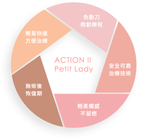 安全可靠治療技術、免動刀微創療程、簡易快速方便治療、無術後恢復期、輕柔觸感不留疤