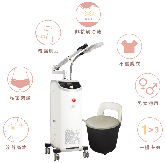非接觸治療,磁場刺激骨盆底肌訓練,穩固定腹腔內的器官,包含 : 膀胱、子宮與直腸等協助維持骨盆和脊柱穩定,強肌緊陰改善性生活。